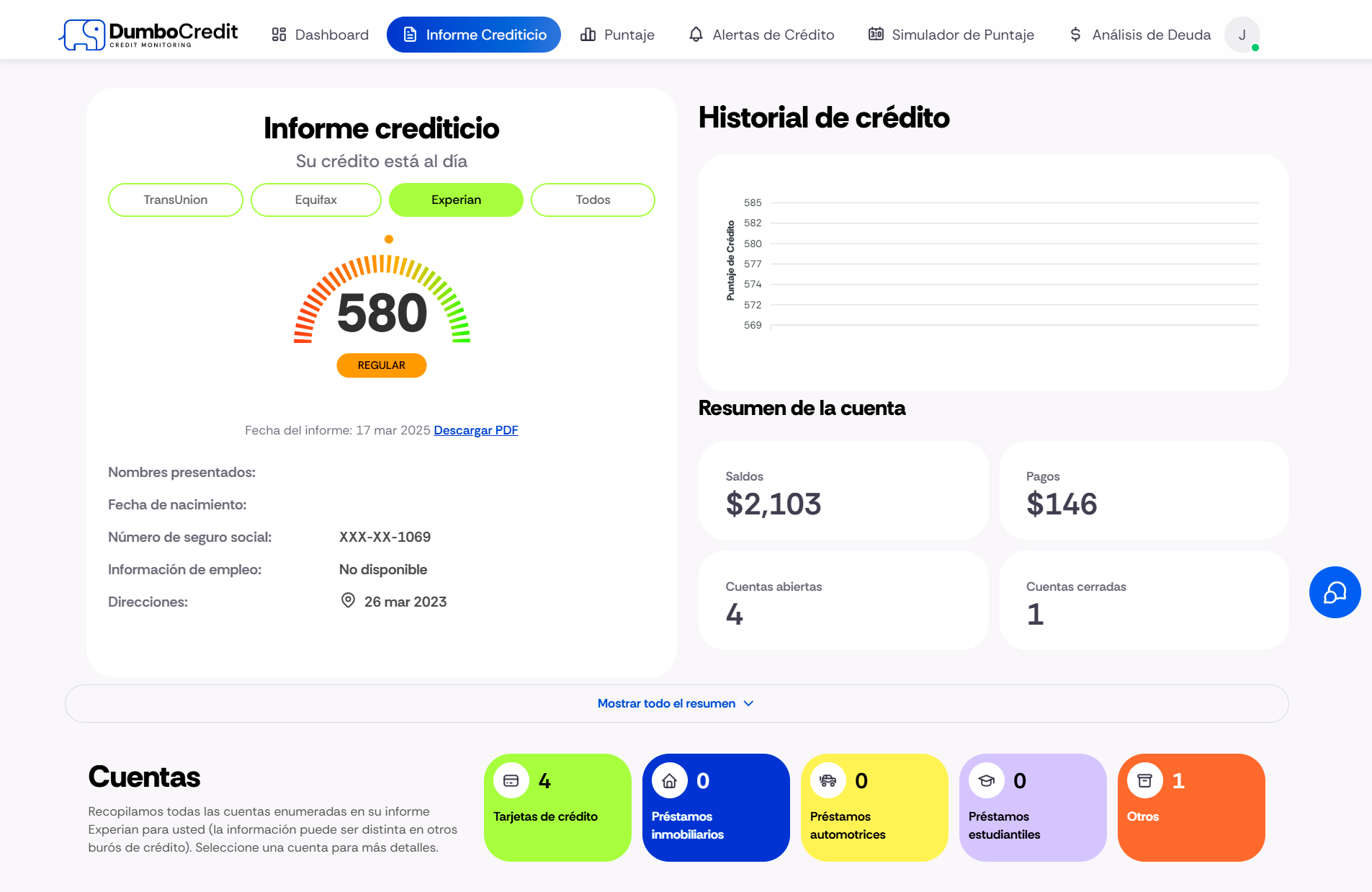 En Dumbo Credit, entendemos que un buen crédito es más que un número: es la llave para acceder a oportunidades que transforman vidas. Es por eso que el primer paso que te ayudamos a dar es entender y visualizar tu crédito de manera correcta y 100% en español, enmarcando tus objetivos a futuro.